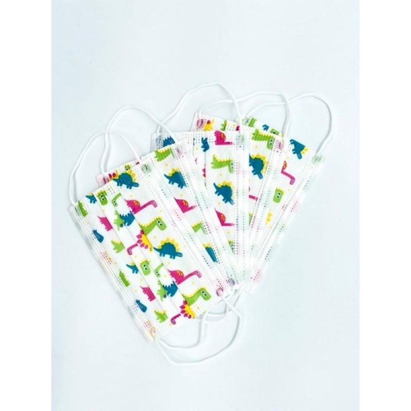 علبة كمامة اطفال لون ابيض رسمه دايناصور ملون ( 50 كمام)